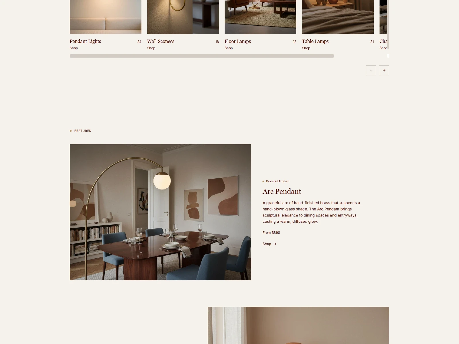 This project focused on presenting handcrafted lighting products with precision and care. The website design emphasises material, form, and lighting quality through controlled layouts and generous spacing. Product pages were structured to support browsing and comparison without distraction, while editorial sections reinforce the brand’s craft and studio practice. The final result is a clean, considered digital showcase aligned with a premium retail offering.